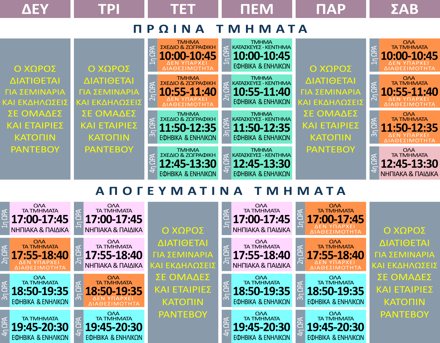 Τα μαθήματα μας γίνονται τις παρακάτω ημέρες και ώρες, οι διαθέσιμες θέσεις για κάθε ώρα είναι 10.